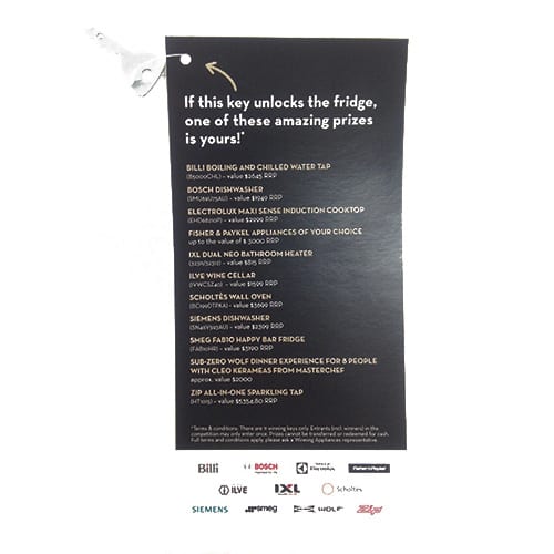 Scotland & Harrisson presented the concept of attracting more customers to the event by offering a series of prizes with the “Do you hold the Winning Key” competition. We filled a Smeg fridge with a series of wonderful prizes and sealed it with a padlock. Then we sent out winning and loosing keys attached to the custom made invitation to come to the store event to win a major prize or one of many in a lucky-dip.