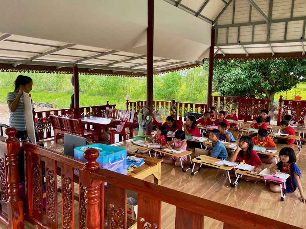 The Asha Foundation for Humanity provided the necessary support to design and construct a traditional Sala Thai, also known as a Pavilion. The Sala Thai design is a major part of the country’s cultural legacy. It reflects both the challenges of living in Thailand’s extreme climate as well as, historically, the importance of architecture to the Thai people’s sense of community and religious belief. And in today’s world, it’s basically a virus safe open classroom environment. Ongoing arts and educational programs were further developed and the Bang Kung Learning Center was established.